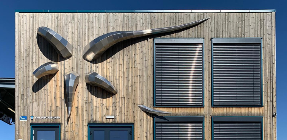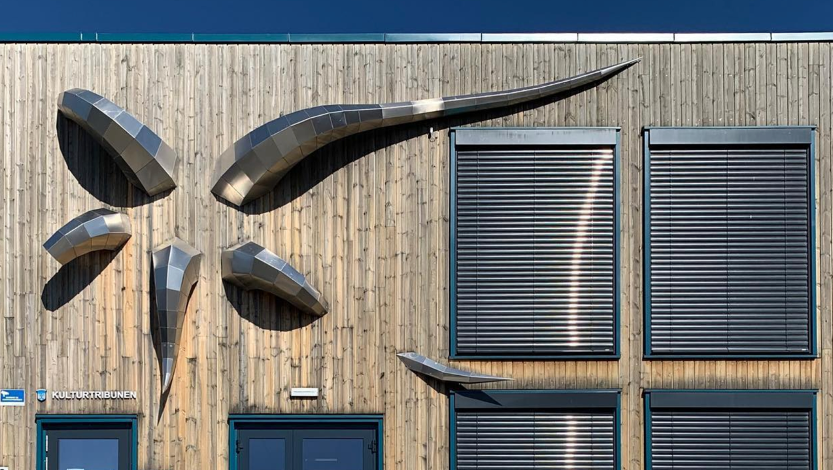 Illustrasjonsbilde 1 : På oppdrag fra Trondheim Kommune, ble skulpturen “Bracchium Hexagonalis” (2016) utformet til fasaden av Kulturtribunen på Ranheim, hvor de har både bibliotek og fritidsklubb. Skulpturen består av 5 ‘armer’ satt sammen av irregulære sekskant-element, montert rett på vegg. Skulpturprosjektet er utviklet med inspirasjon og utgangspunkt i Ranheims historie, nåtid og fremtid.